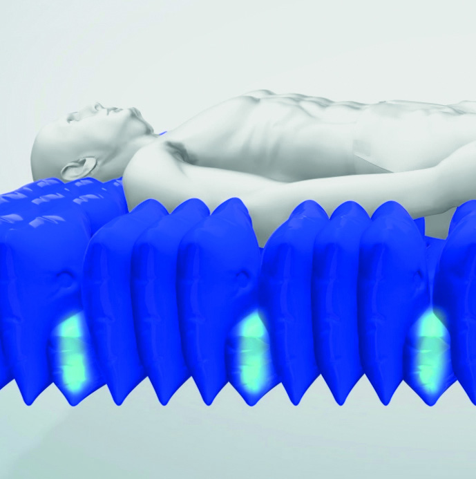 De gepatenteerde Tissueguard aircel technologie zorgt voor het gedeeltelijk inzakken en omsluiten van de patiënt in het ondersteuningsvlak van het matras, waardoor druk en schuifkrachten worden gereduceerd.